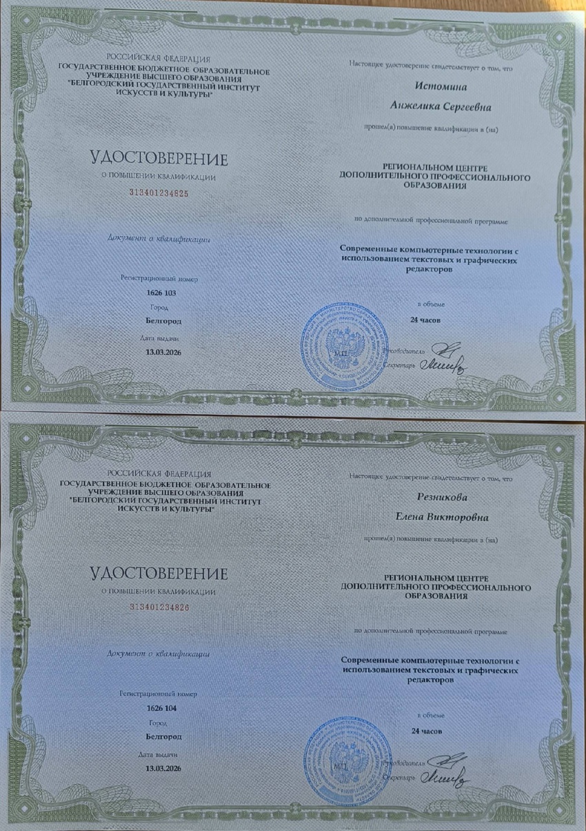 13 марта 2026 года в РЦДПО Бгиик завершились курсы повышения квалификации по дополнительной профессиональной программе "Современные компьютерные технологии с использованием отечественных текстовых и графических редакторов". Преподаватель курса, Хворостов Максим Алексеевич – методист отдела менеджмента качества образования со слушателями на занятиях подробно рассмотрели и познакомились с отечественными текстовыми и графическими редакторами LibreOffice Writer, Мой офис Текст, OnlyOffice docs, LibreOffice Draw, Gimp и другими. На занятиях слушатели приобрели навыки работы с ОС Linux, получили полный обзор встроенных приложений. Также на практических занятиях были рассмотрены принципы взаимодействия с нейросетями. Работники МБУК "ЦКС" Красногвардейского муниципального округа Истомина А.С. и Резникова Е.В. получили удостоверения установленного образца.